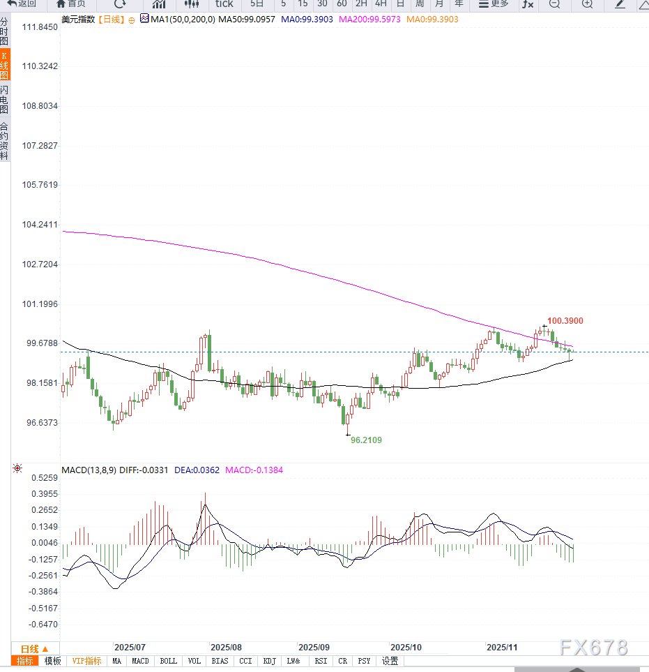 从日线级别观察,美元指数在跌破短期均线后进入横向整理格局,K线围绕99.30—99.60区间震荡,MACD保持低位粘合,显示动能不足;